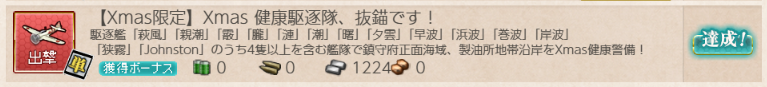 | 任務①【Xmas限定】 Xmas 健康駆逐隊、抜錨です! | 1-1 1-3 | 新型兵装資材 ネジ4など | 単発 出撃 |