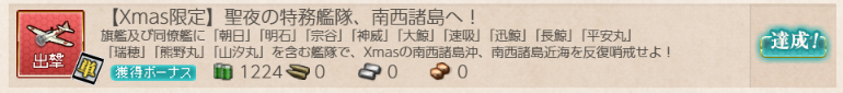 | 任務②【Xmas限定】 聖夜の特務艦隊、南西諸島へ! | 1-2 2-1 | 新型兵装資材 補強増設など | 単発 出撃 |