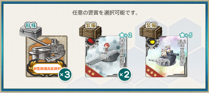 新型砲熕兵装資材×3 or 14inch/45 三連装砲☆2×2 or 15.2cm三連装砲☆5
