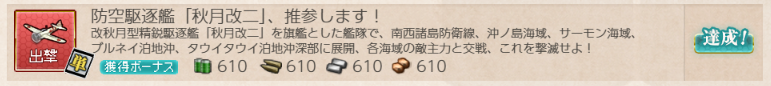 | 秋月改二任務① 防空駆逐艦「秋月改二」、 推参します! | 1-4 2-4 5-4 7-1 7-2-2 | 13号対空電探改☆8 10cm連装高角砲改 +高射装置改 or試製 61cm六連装(酸素)魚雷 | 単発 出撃 |