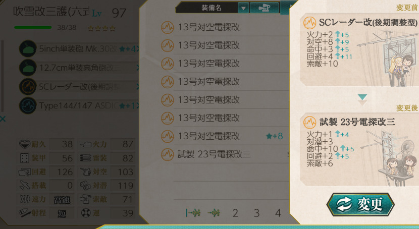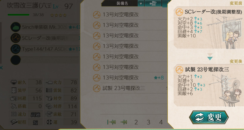 吹雪改三の初期装備だった試製 23号電探改三から更新することも可能ですが、実はSCレーダーは23号電探の上位互換……では全くありません。