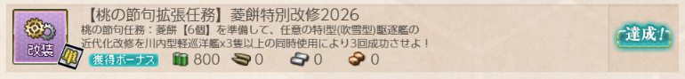 | 任務⑦【桃の節句拡張任務】 菱餅特別改修2026 | – | 単発 工廠 |