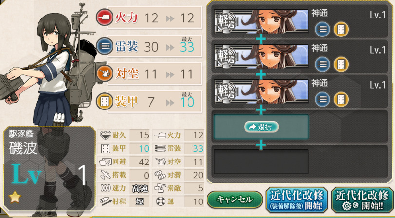 特1型駆逐艦(吹雪型)の近代改修を川内型軽巡洋艦(川内・神通・那珂)×3以上の同時使用で3回成功。