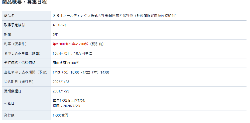 タイトルの通りですが、2026年1月13日(火) 10:00より第46回SBIホールディングス社債が発売されることが決定されました。