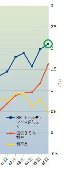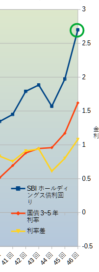 黄色のグラフの数値が大きいほど両者の金利差が大きいことになり「国債を買うよりもSBI社債を買うほうがお得」となります。