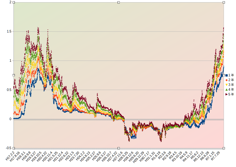 縦軸が金利、横軸が日時。青が1年物、赤が2年物、黄色が3年物、緑が4年物、茶色が5年物です。