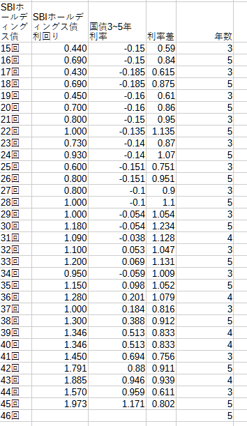 ただし注意点があって、上のグラフにはSBI社債の3年物・4年物・5年物がすべて含まれています。そのためグラフがややジグザグになってしまっております。