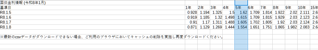 ちなみに、2026/1/8現在の国債5年物水準は以下のようになっています。