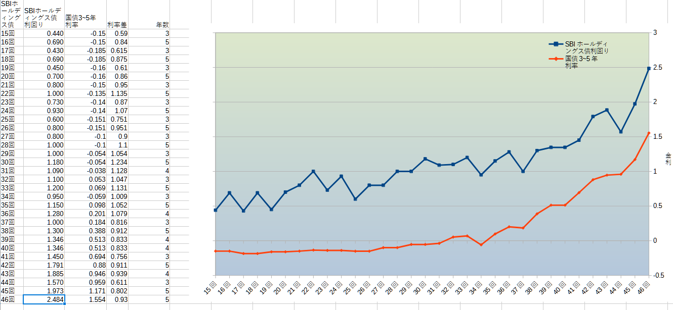 上のグラフは第15回SBIホールディングス社債(2018年)~同第46回(2026年・今回)の金利と、国債3~5年物の利率を示しています。