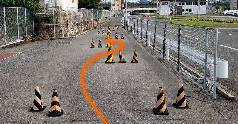 スラロームと言うのはコース内にこのようにパイロンが設置してあって、右に左に急ハンドルを切って通過しなくてはなりません。検定ではパイロンに接触すると一発アウト、検定中止です。