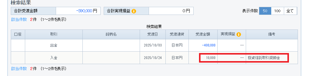 口座を確認すると、本当に1万円が入金されていました。名目は「投資信託取引奨励金」