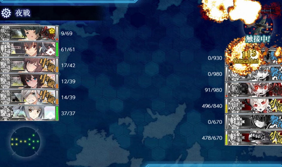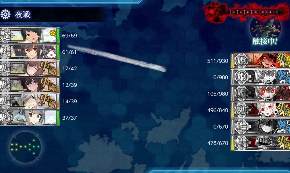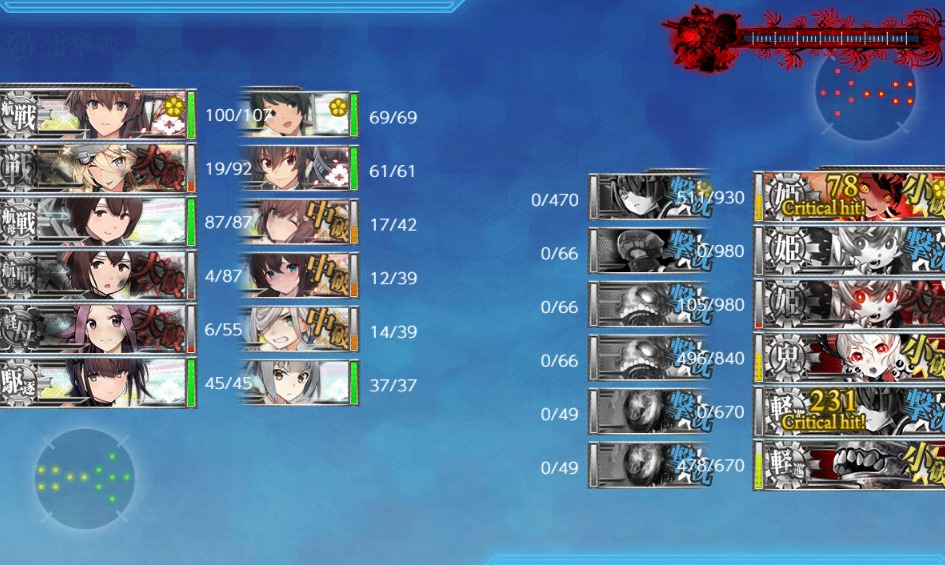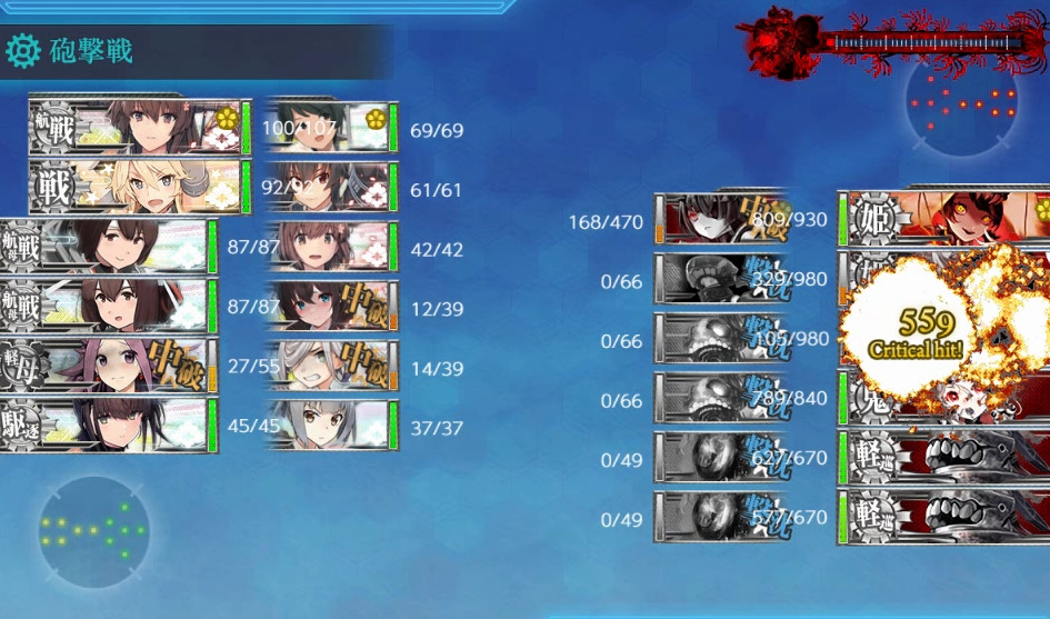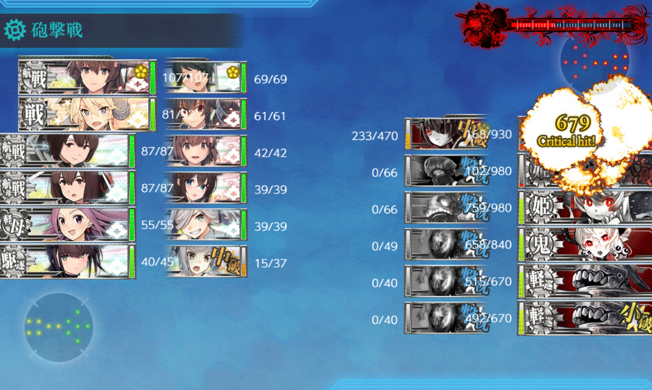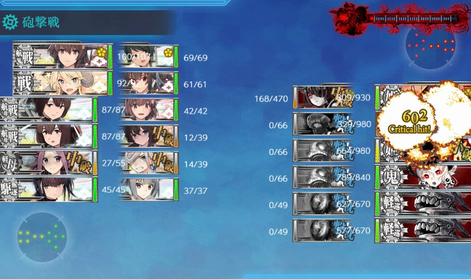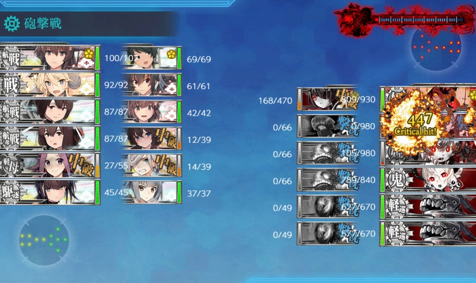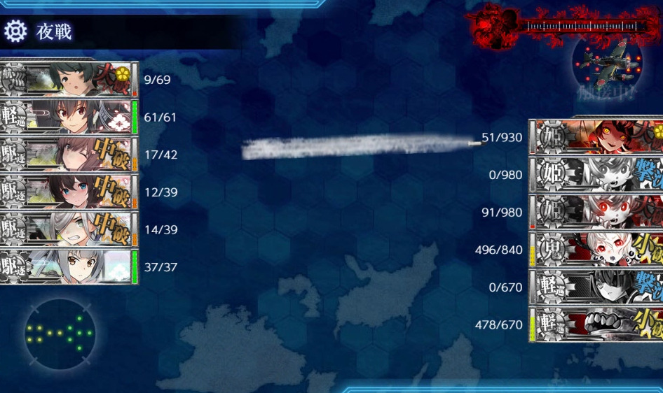 伊勢日向が地味に大火力を出してくれるのでやはり軽空母に攻撃させる(攻撃できない)よりはこの形がオススメかなと。