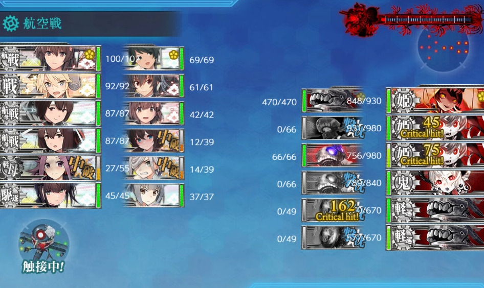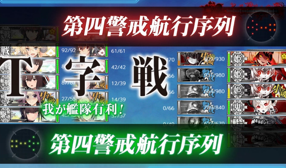 開幕航空戦と決戦支援終了。ナが全部消えて第2旗艦も中破。しかもT有利!
