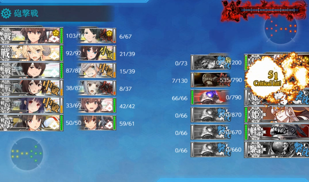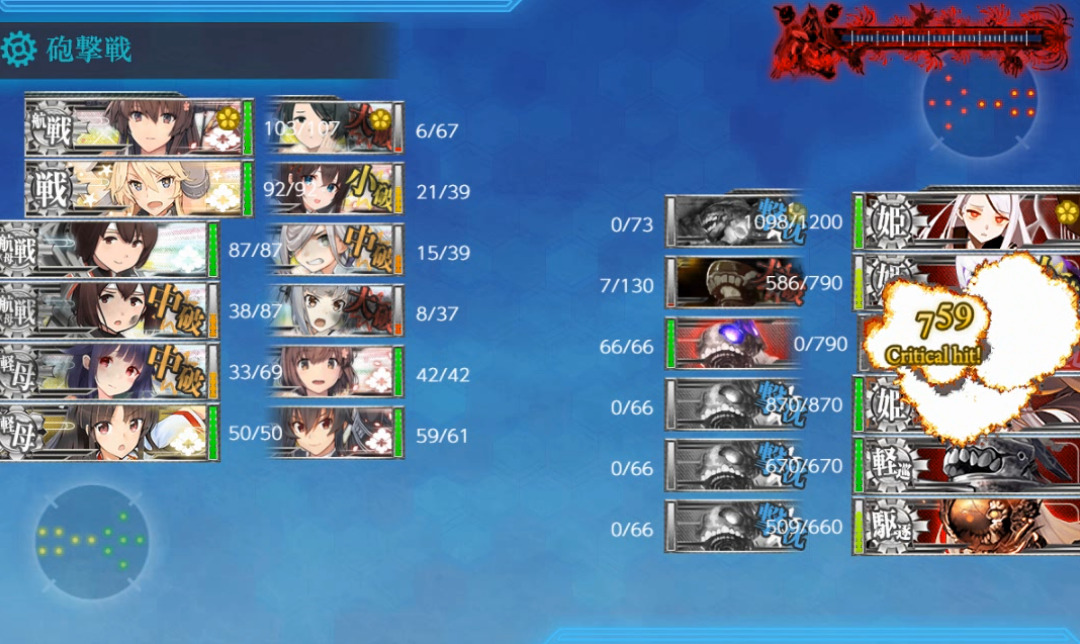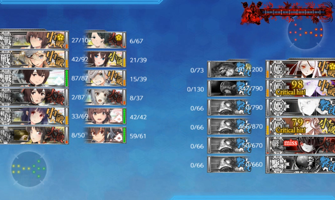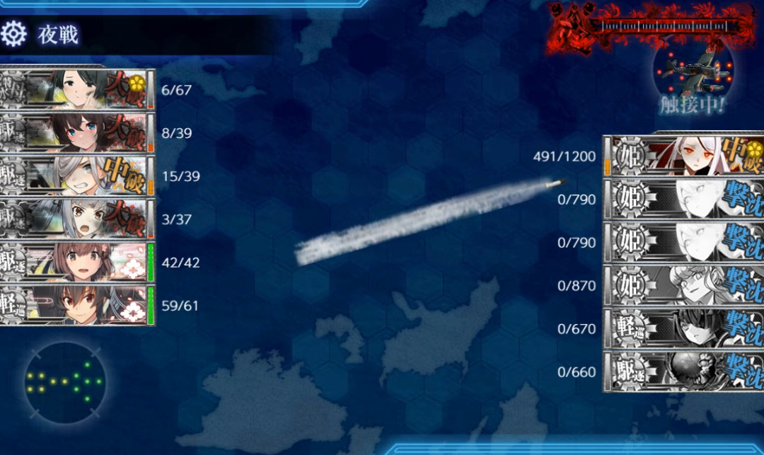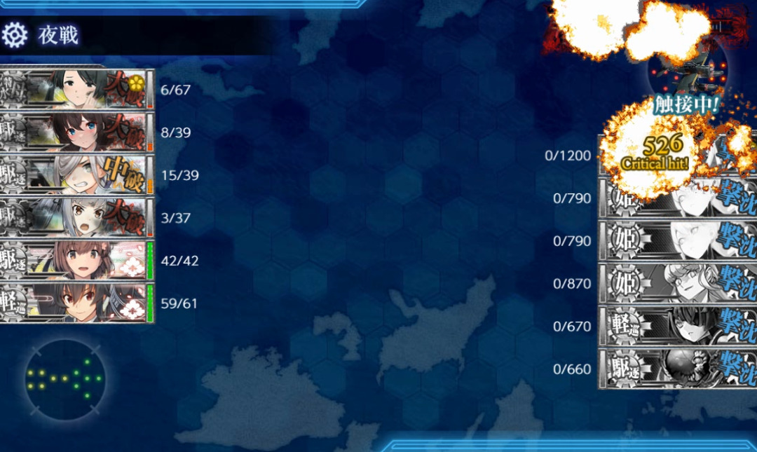 昼戦終了時でなんやかんやいい感じの形に。4択庇いゼロ!しかもボスも中破で余裕でワンパン圏内!