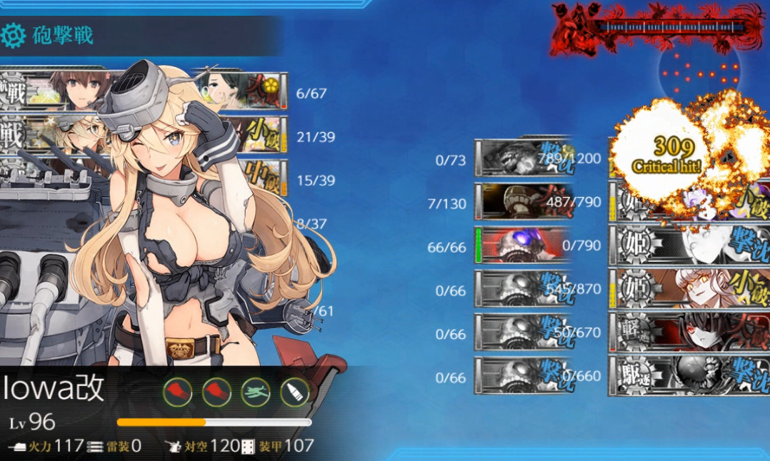すぐお座りするしタッチは外すしでアイオワに対する負の感情が溢れ出てきそうでしたが、汚名返上とばかりに昼連撃でボスに309・102の大ダメージ!!強い!!ゆるした!
