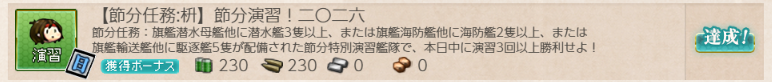 | 任務①【節分任務:桝】 節分演習!二〇二六 | – | 戦果+12/日 | デイリー 演習 |