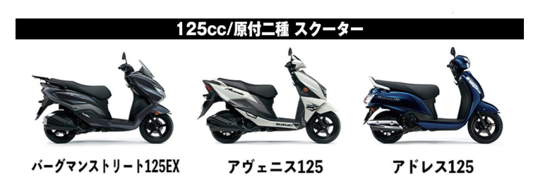 原付一種 (50 cc以下) | 原付二種 (50~125 cc) | 普通二輪 (125~400 cc) | 大型二輪 (400cc~) | |