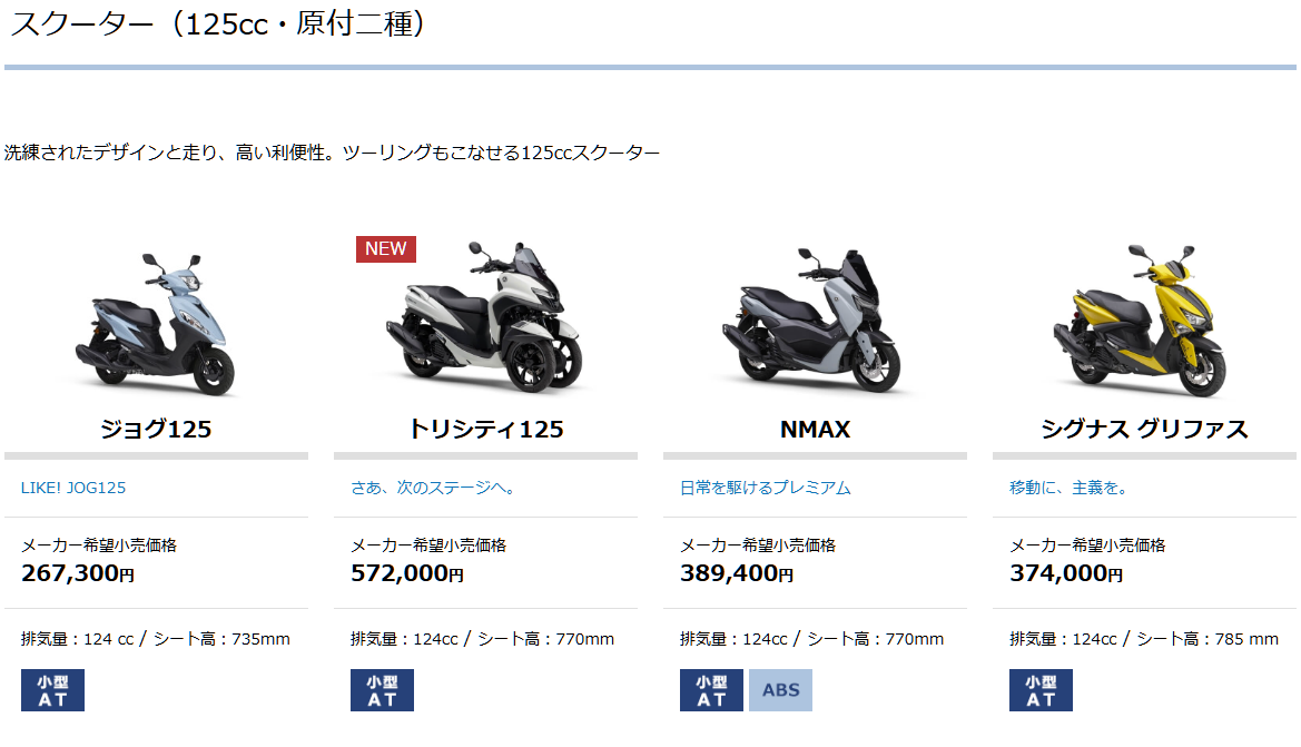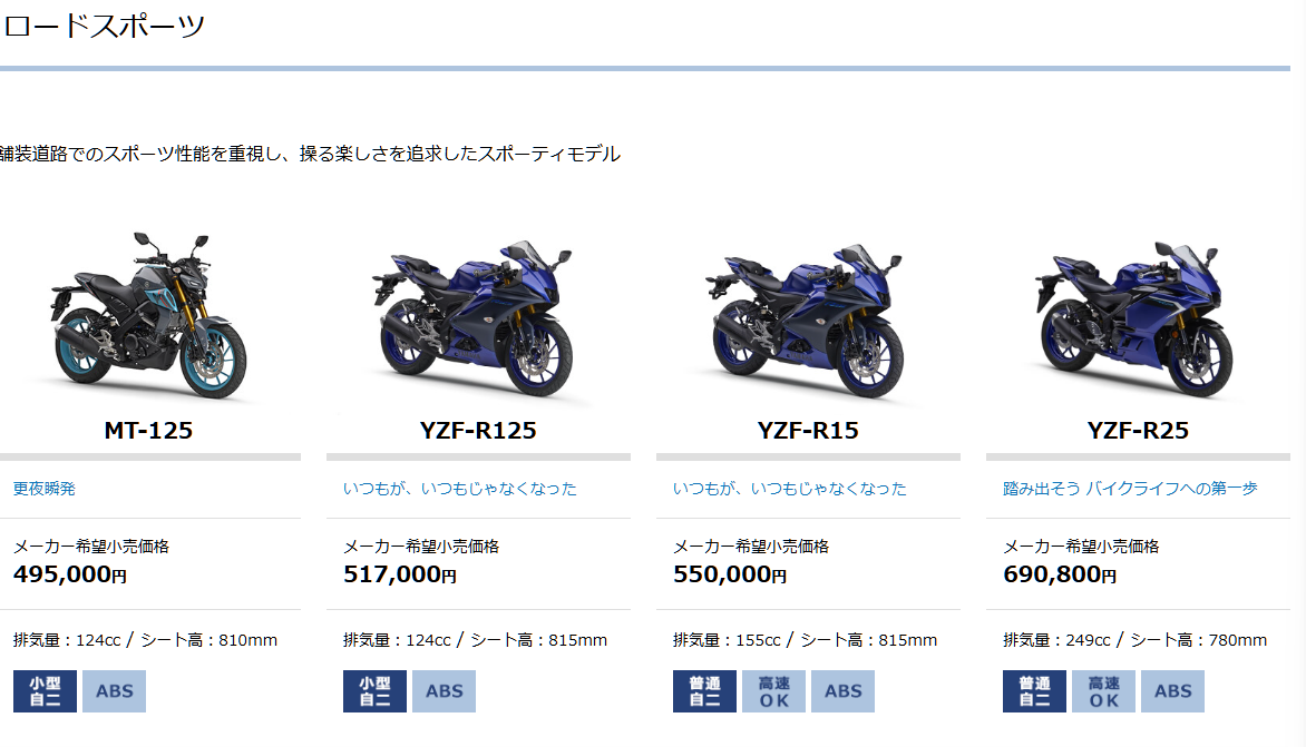 原付には見えないスポーツタイプの場合、一番左のMT-125が50万円から。